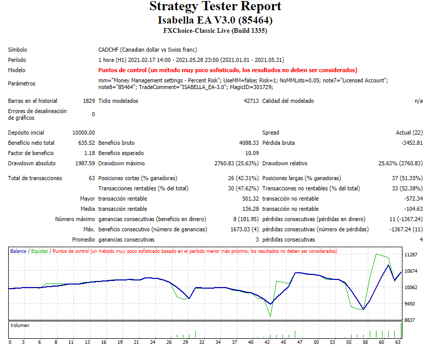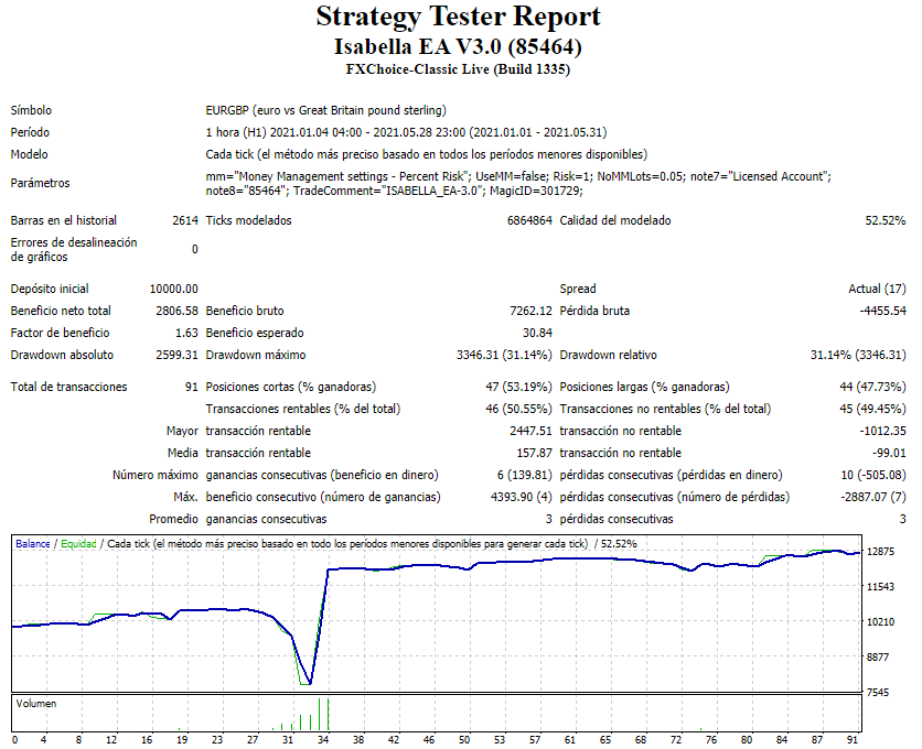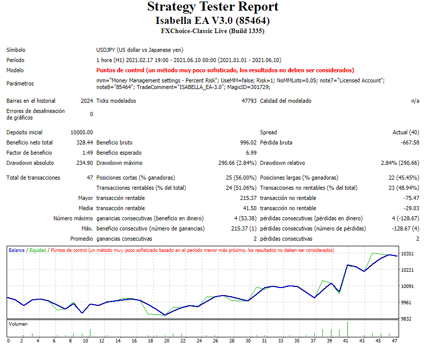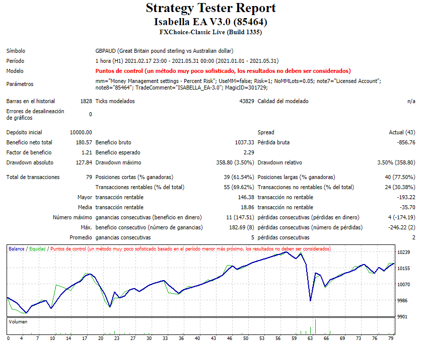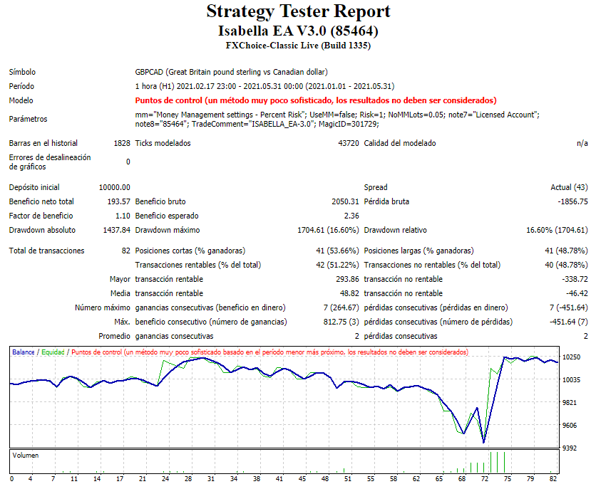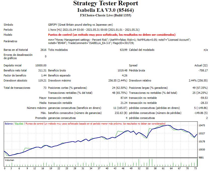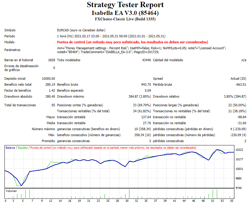Isabella Expert Advisor es un robot de comercio de divisas que se ejecuta en la plataforma de trading gratuita MetaTrader 4 (MT4), analizando el mercado de divisas para encontrar la dirección futura de los precios y encontrar los mejores puntos de entrada y salida de las operaciones ganadoras.